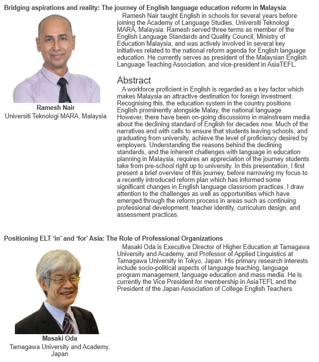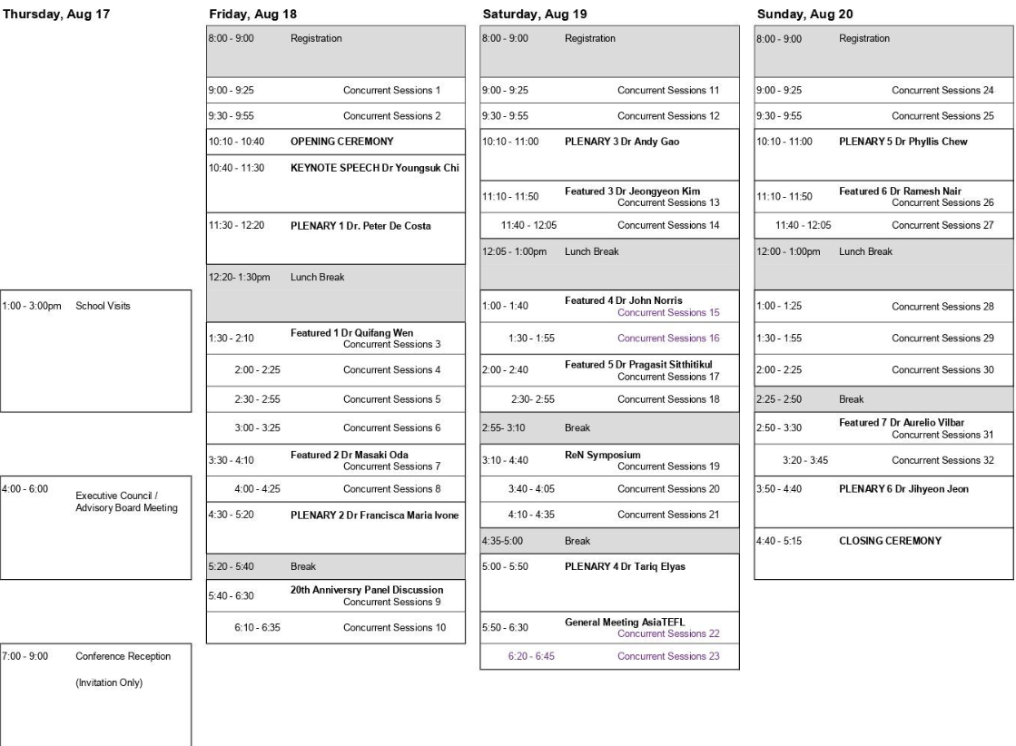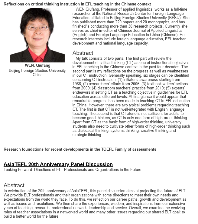 This year's conference is very special as it celebrates the 20th anniversary of the foundation of AsiaTEFL. For the past 20 years, AsiaTEFL conferences have been held annually in various Asian countries (10!), where ELT practitioners, policymakers and researchers have gathered together to share their academic and scholarly works and knowledge, and to shape global networks and bonds. This year's theme, ‘Celebrating ELT in Asia: Visions and Aspirations', was set to suggest visions for and aspirations of ELT in Asian contexts by reflecting on heated discussion over the past years, examining the present issues and topics, and anticipating the future of ELT in Asia. In pursuit of this aim, we invited very special speakers from diverse Asian countries and beyond. We would like to extend our sincere gratitude to the speakers who cordially accepted our invitation. Please join us in whole-heartedly welcoming keynote speaker Youngsuk YS Chi, the President of Elsevier, and the six plenary speakers, Prof. Jihyeon Jeon from Korea, Prof. Phyllis Lian-Ghim Chew from Singapore, Prof. Peter de Costa from USA, Prof. Andy Gao from Australia, Prof. Francisca Maria Ivone from Indonesia, and Prof. Tariq Elyas from Saudi Arabia. A warm welcome is also extended to our seven featured speakers, Prof. Masaki Oda from Japan, Prof. Qirfang Wen from China, Prof. Pragasit Sitthitikul from Thailand, Prof. Ramesh Nair from Malaysia, Prof. Jeongyeon Kim from Korea, Prof. Aurelio Vilbar from Philippines, and Dr. John Norris. Not only do these speakers offer geographically-diverse perspectives, but their years of scholarship in wide-ranging fields of ELT provide deep insights for all.