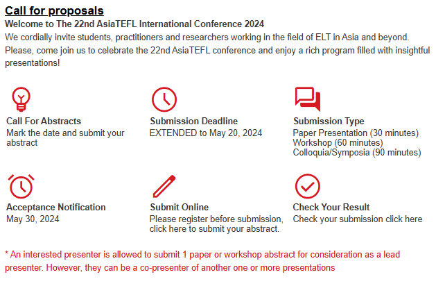 The 22nd AsiaTEFL International Conference invites research papers, workshops, colloquia/symposia, and poster sessions. Abstracts should be no more than 250 words, sent via our submission platform at https://asiatefl2024.org/index.php?go=register Topics